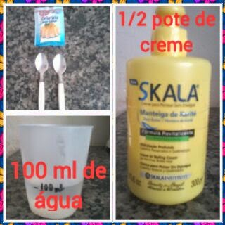 1 - Pego 2 colherinhas (de café) de gelatina incolor, misturo com 50 ml de água (misturo bem até que não haja mais nenhum cristal) e levo ao microondas por 30 segundos. Depois que esquentou eu coloco + 50 ml de agua fria e misturo novamente. Depois junto essa mistura com 150 gramas de creme de pentear (uso o Skala manteiga de karité, é ótimo) e coloco no potinho. Pronto!!!